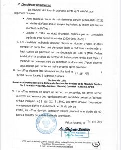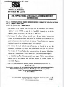 Lualaba : Le secteur de Luilu procède à un Avis d’Appel d’Offres National AA0-020-T-CGPMP-SL-023 relatif à l’électrification des grandes artères du secteur à Lualaba-Mupanja (1500 Poteaux)
